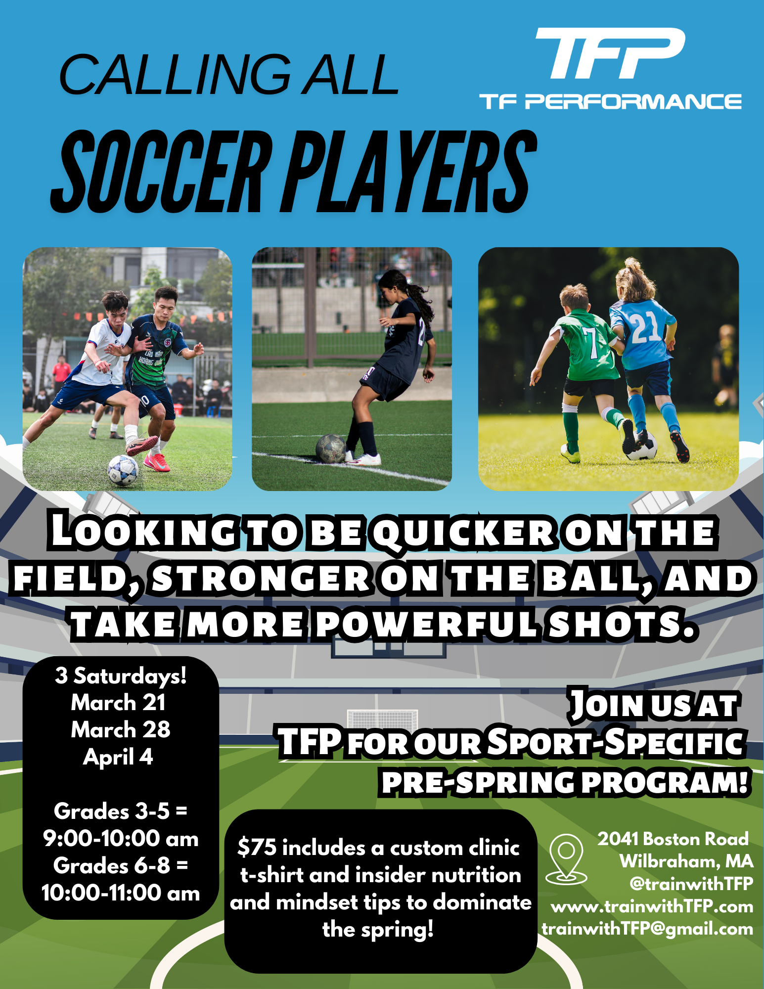 As spring approaches, TF Performance is your go-to for improving on the field. Join us for a 4-session sport-specific speed, agility, and strength training clinic designed to bring your performance to new heights. This clinic is perfect for anyone looking to enhance the following aspects crucial for sports success: